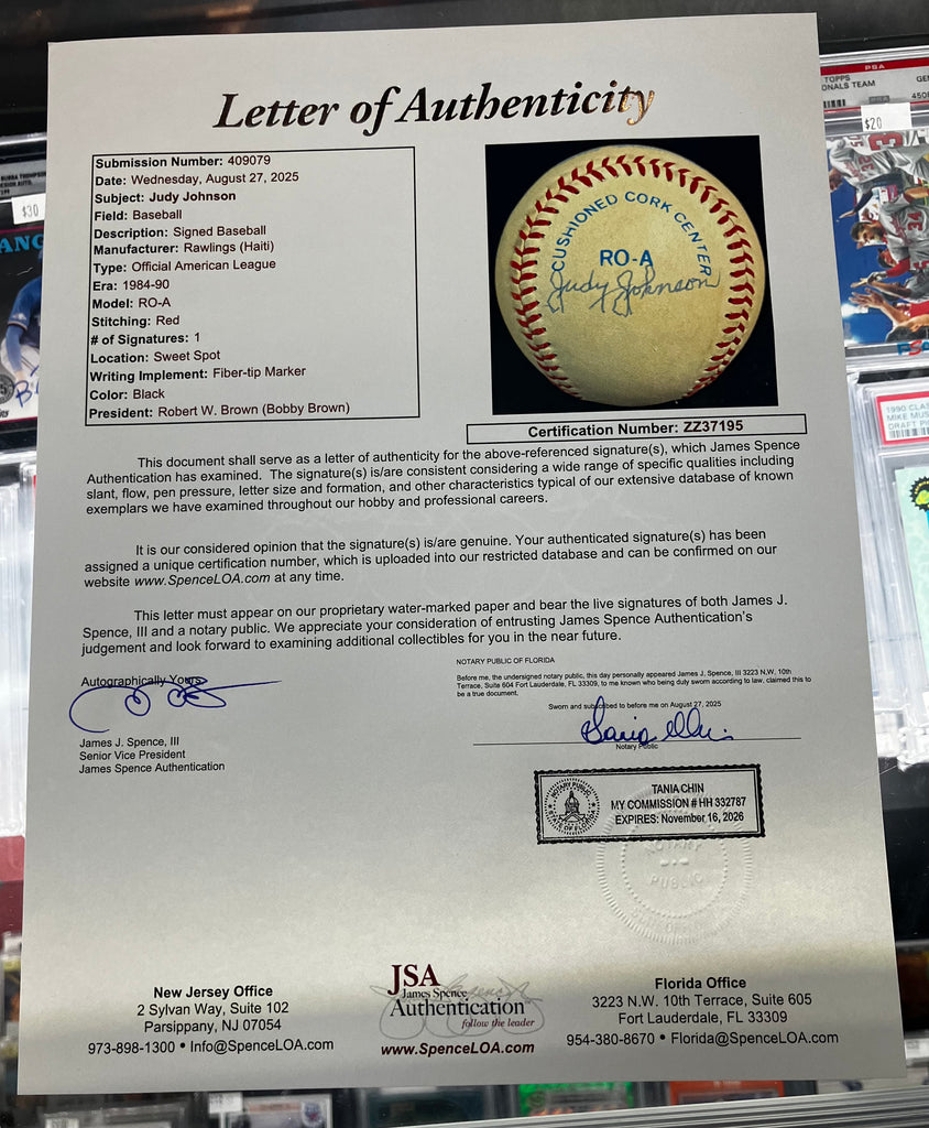 inscribed Judy Johnson signed baseball, Rawlings Authentic baseball