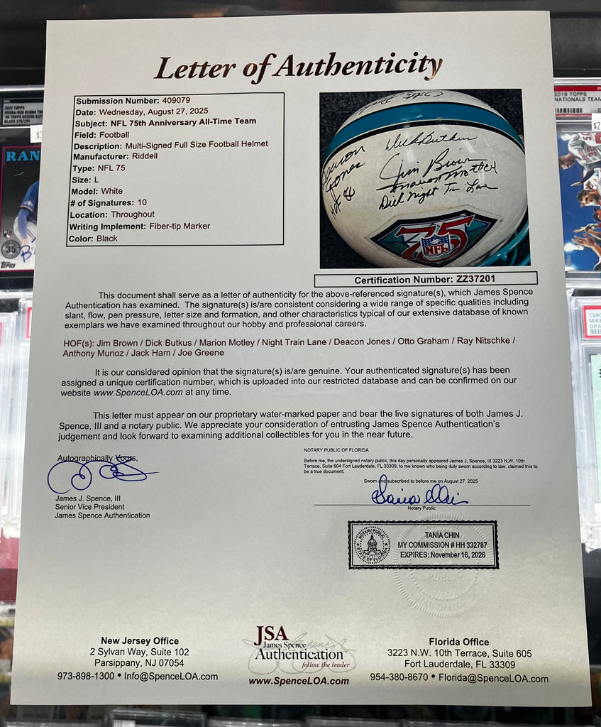 This is an NFL 75th Anniversary All-Time signed helmet with JSA COA