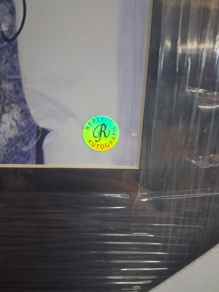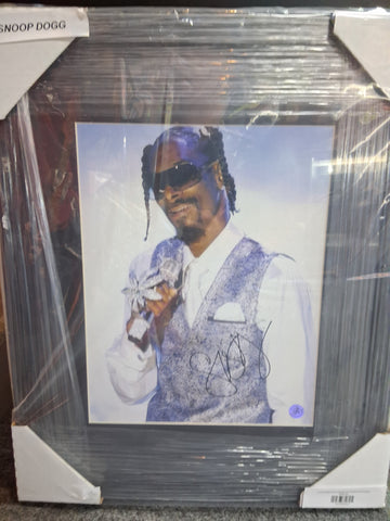 This item is a replica signed framed 22X18 photo. It is signed by Snoop Dogg. it is a photo of him signing into a mike and he is wearing a white button up shirt with a white tie and a blue ish vest.